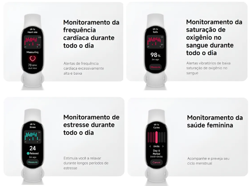 Monitoramento Avançado de Saúde: Mede frequência cardíaca (HR), oxigenação do sangue (SpO₂), qualidade do sono e níveis de estresse.