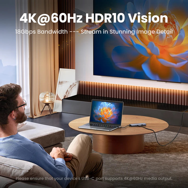 Transforme a conectividade do seu dispositivo com o UGREEN USB-C Hub 4K60Hz, um adaptador multifuncional que combina desempenho, velocidade e versatilidade. Com saída HDMI 4K60Hz, portas USB 3.0, leitor SD/TF e Power Delivery de 100W, ele é a solução perfeita para trabalho, estudos e entretenimento.